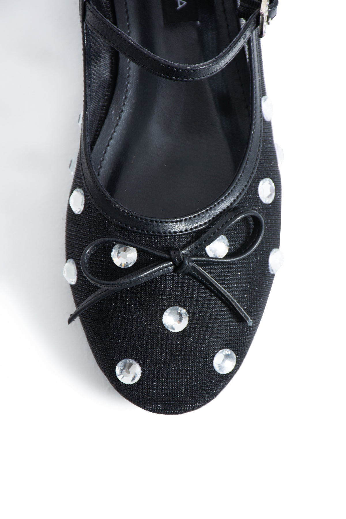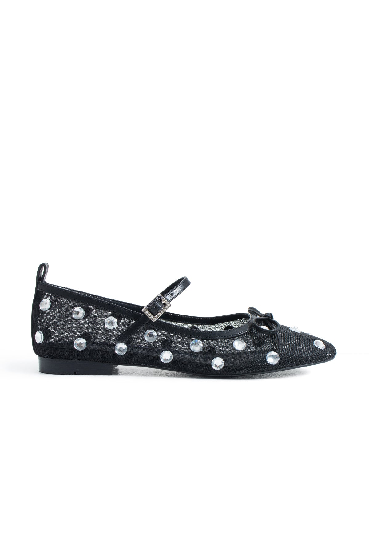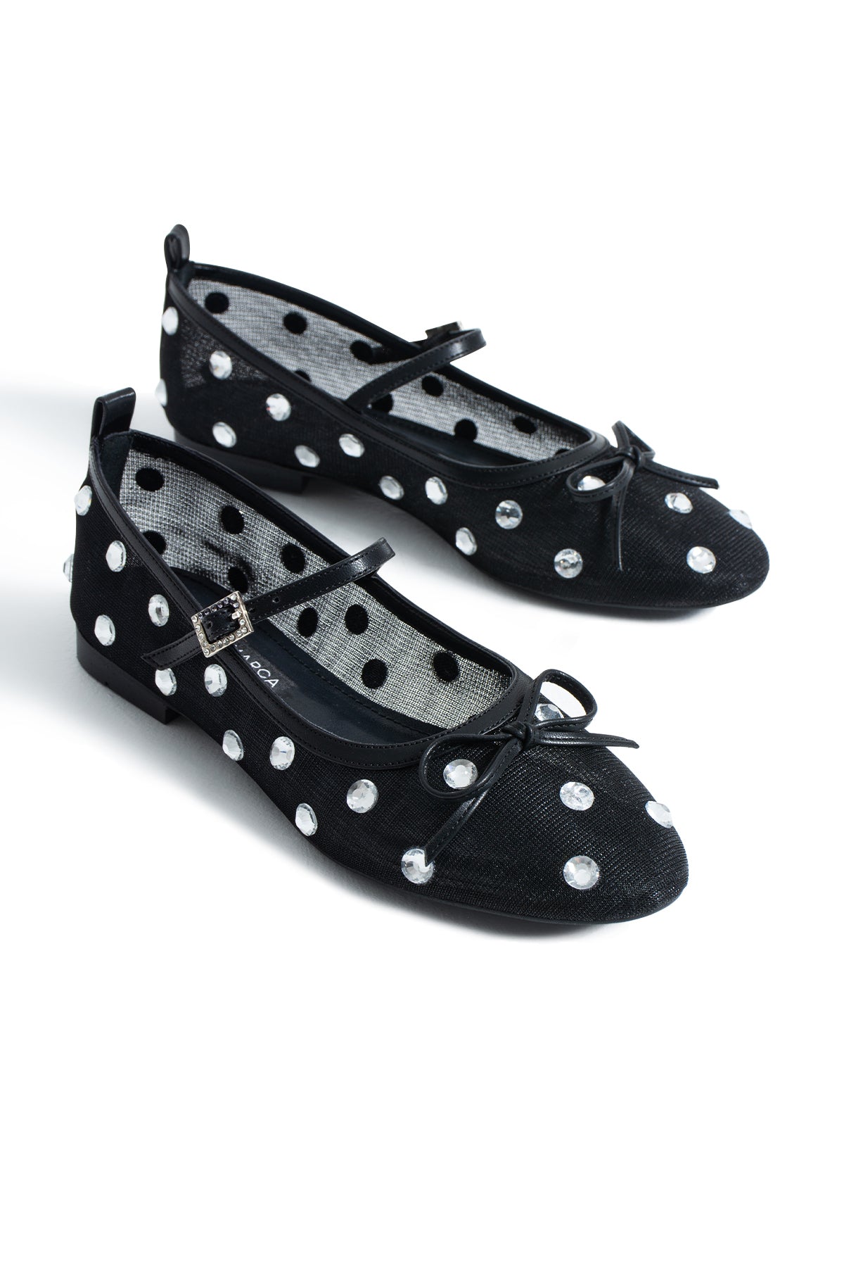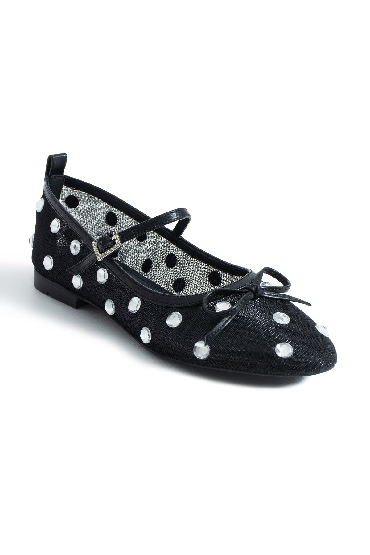 The tightly woven mesh upper gives the design a light yet distinctive structure, while crystal glass stones placed along the surface catch the light with every step, creating a delicate sparkle. The thin strap across the foot and the crystal-studded buckle detail add an elegant accent to the model, while the round toe form and minimal lacing detail provide a timeless balance that preserves the classic ballerina aesthetic.