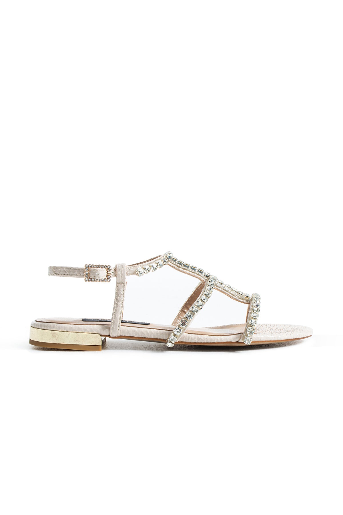 With its crystal-embellished straps, this sandal brings a powerful design together with light.