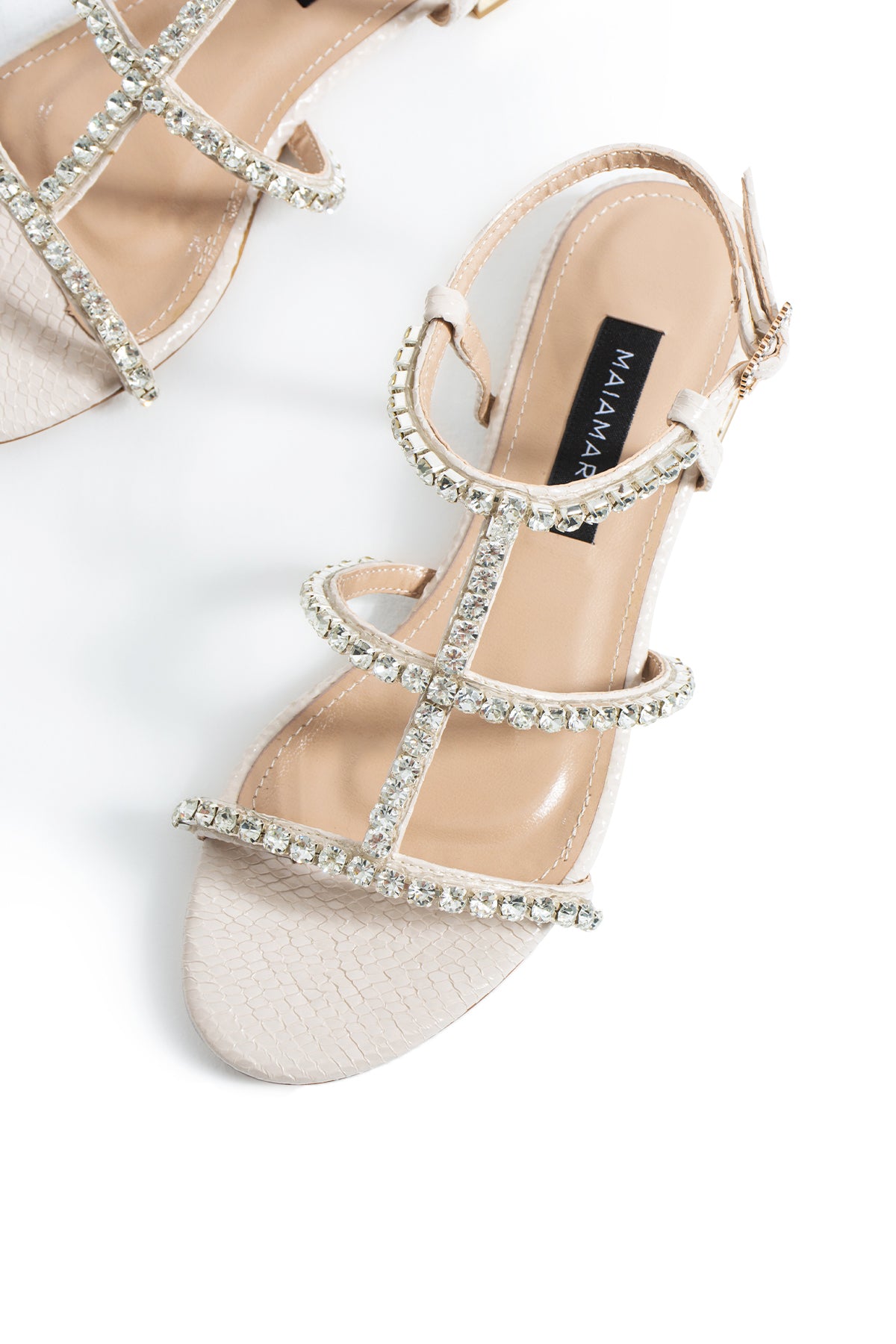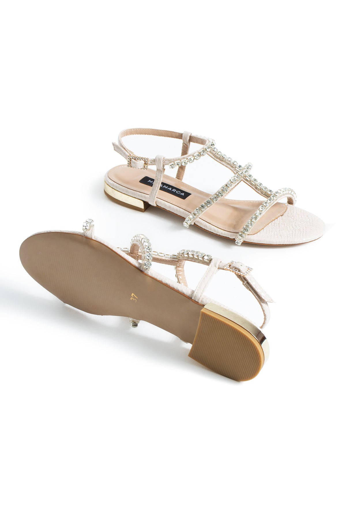 While the specially textured vegan leather surface adds depth to the model, the crystal stones along the straps reflect light with every step, creating a striking effect. The thin-strapped structure gracefully embraces the foot and offers balanced wear thanks to the ankle strap.