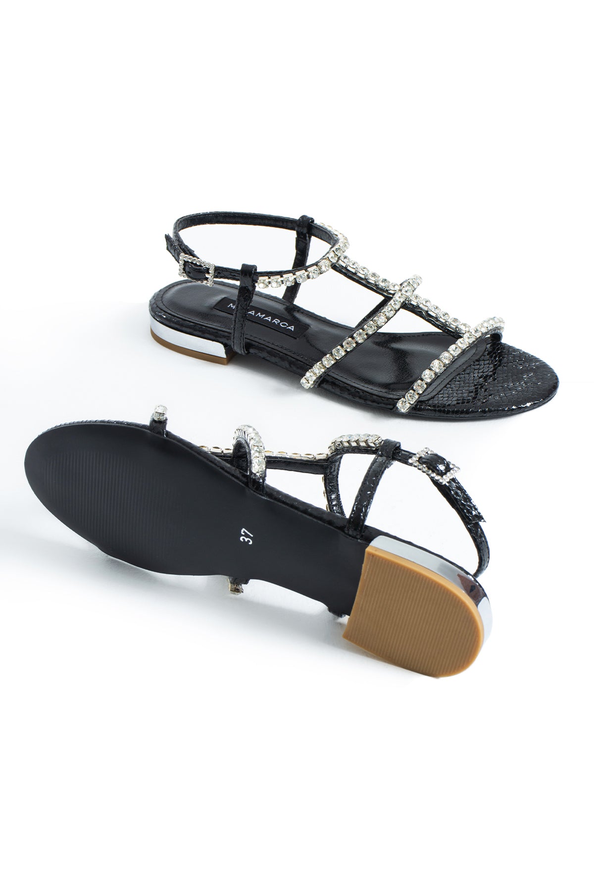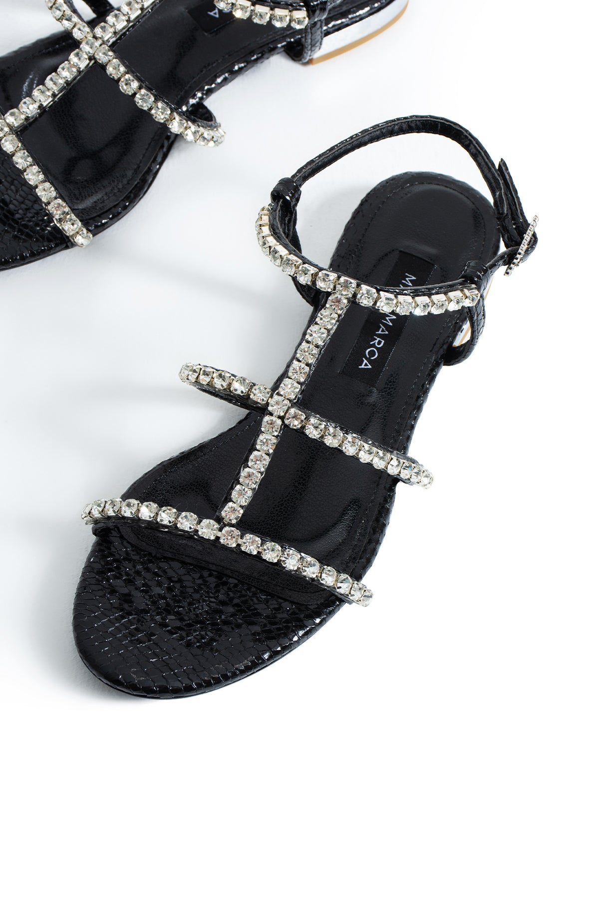 The specially textured vegan leather surface adds depth to the model, while the crystal stones along the straps reflect light with every step, creating a striking effect. The thin strap structure gracefully hugs the foot and offers balanced wear thanks to the ankle strap.