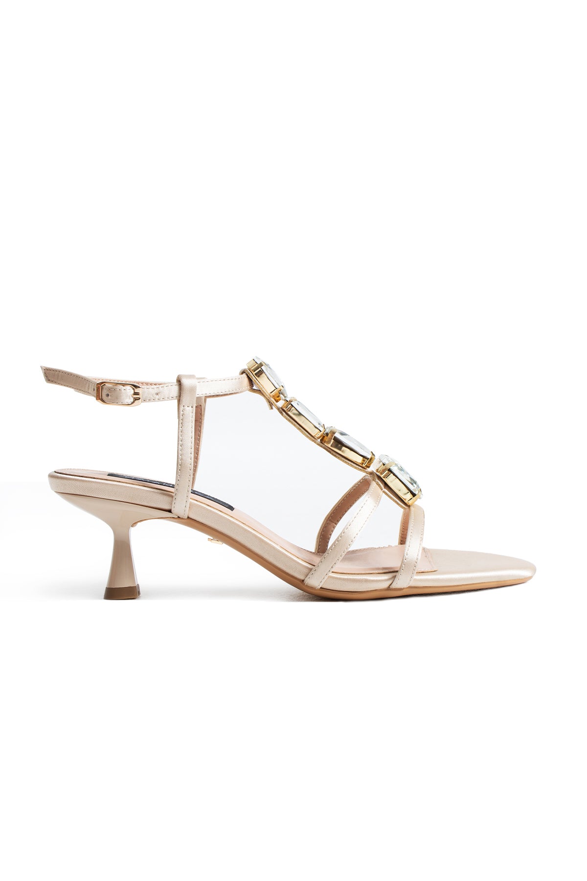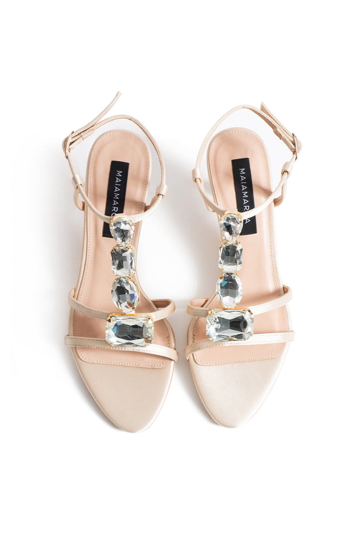 The fluid-looking satin surface meets large cut crystal stones along the upper section, giving the model a powerful sparkle. While the thin straps elegantly embrace the foot, the ankle strap provides balanced and secure wear.