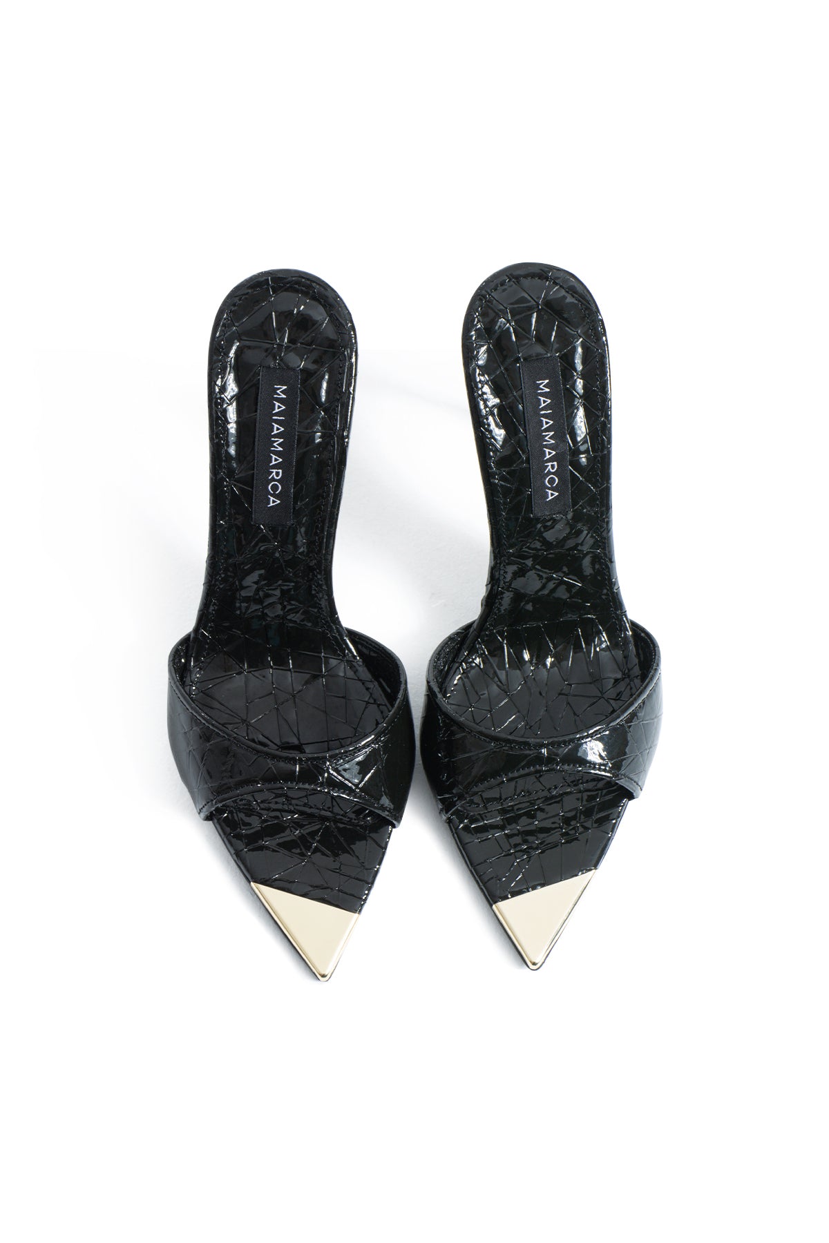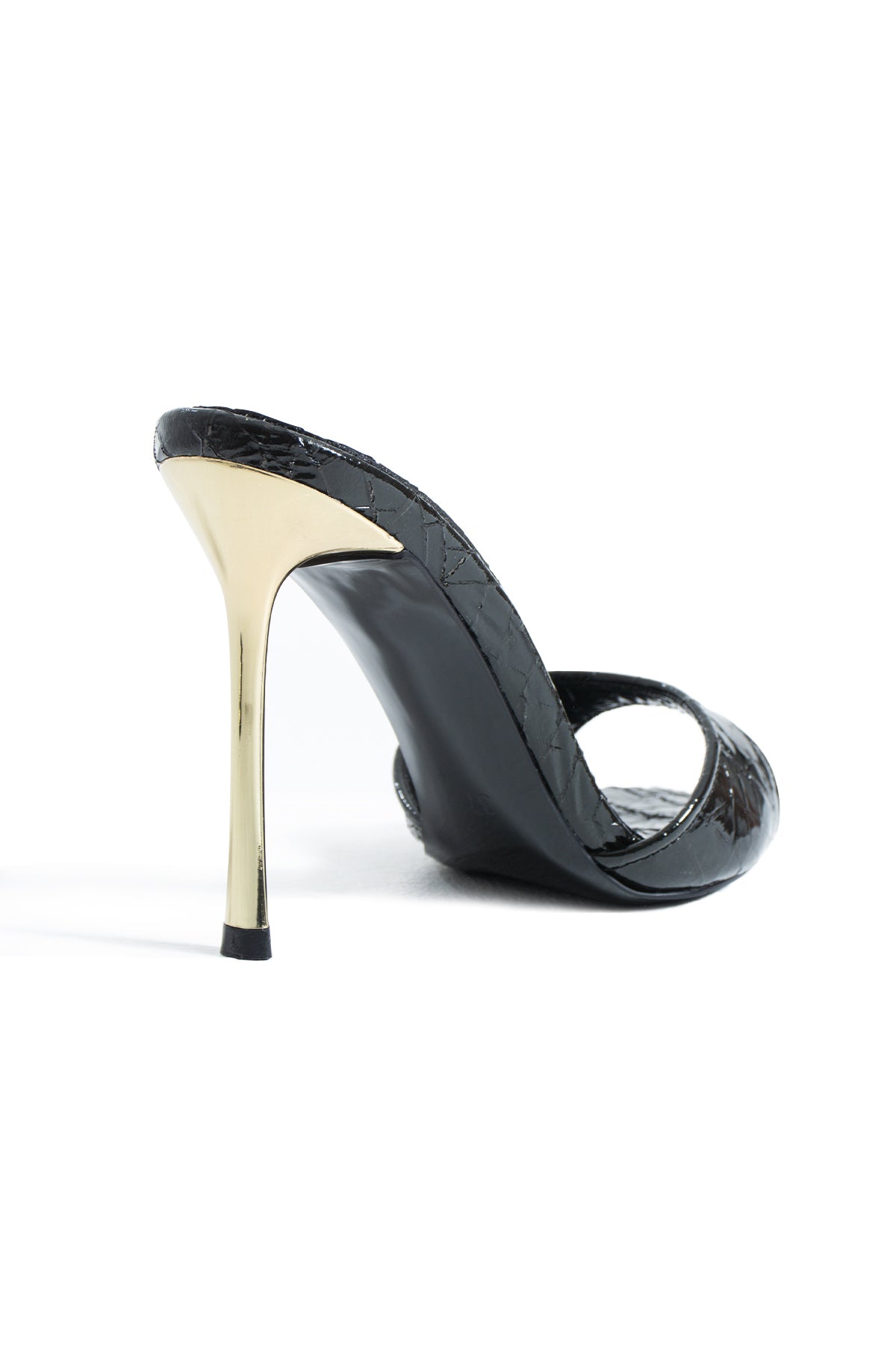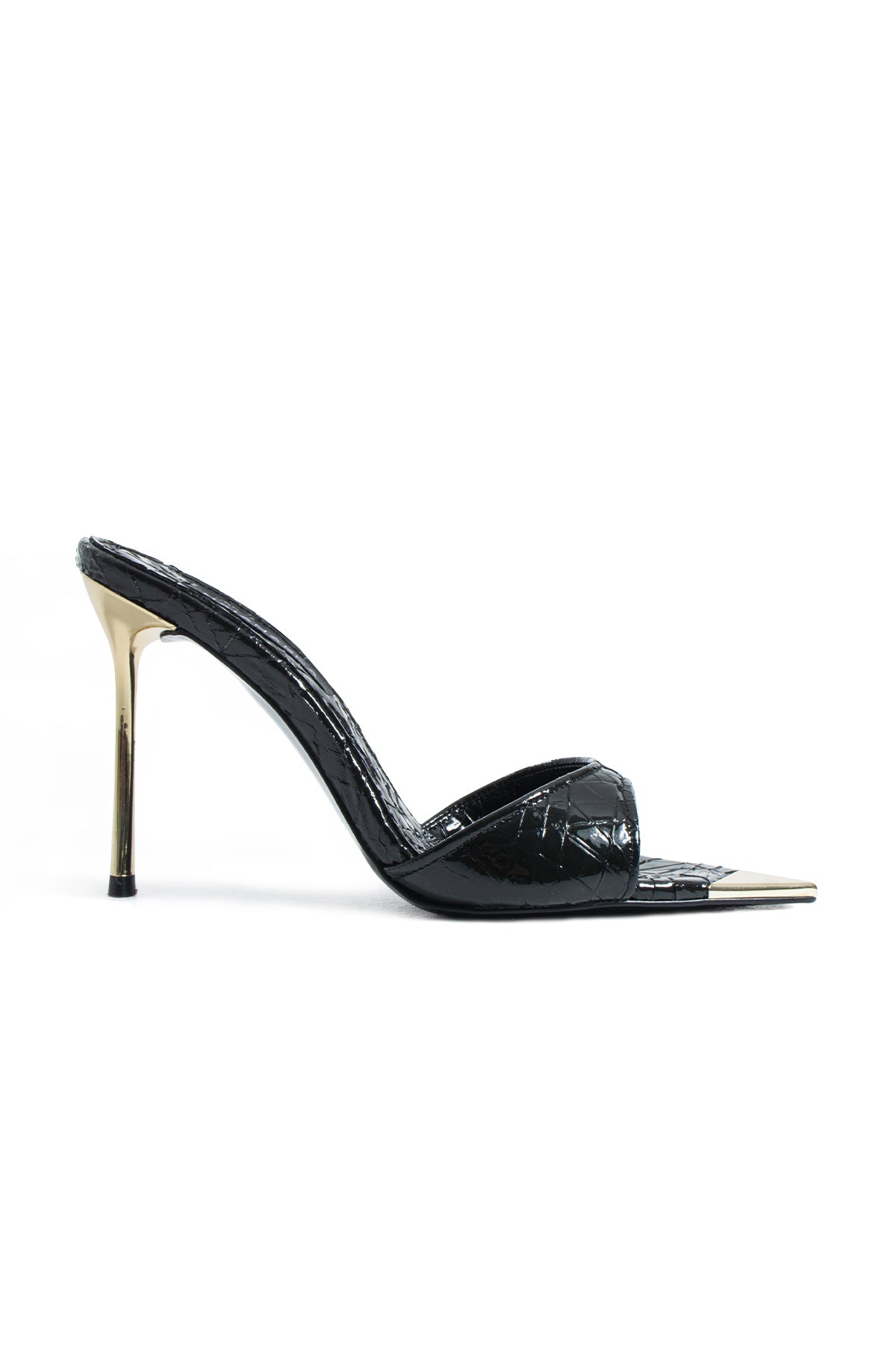 Özel dokulu vegan deri yüzeyi modele derinlik ve karakter kazandırırken, parlak yüzey dokusu ışığı her açıdan yakalayarak güçlü bir görünüm yaratır. Ön kısmında yer alan altın tonlu metal burun detayı tasarıma modern ve iddialı bir dokunuş eklerken, minimal bant formu ayağı zarif bir şekilde vurgular.