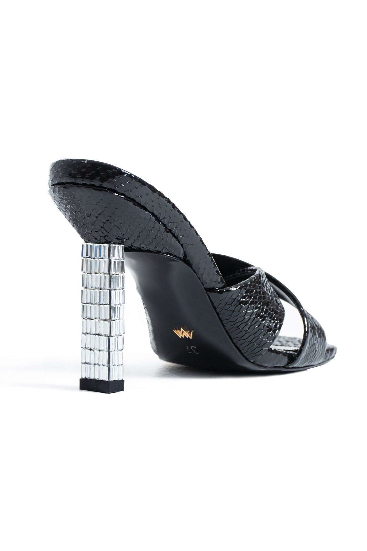 Yılan efektli vegan deri yüzeyi tasarıma sofistike bir görünüm kazandırırken, çapraz bant formu ayağı zarifçe sarar. 9 cm topuk yüksekliği feminen bir yükselti sağlarken, topuk üzerindeki kristal detaylar tasarıma ışıkla hareket eden rafine bir ışıltı ekler.