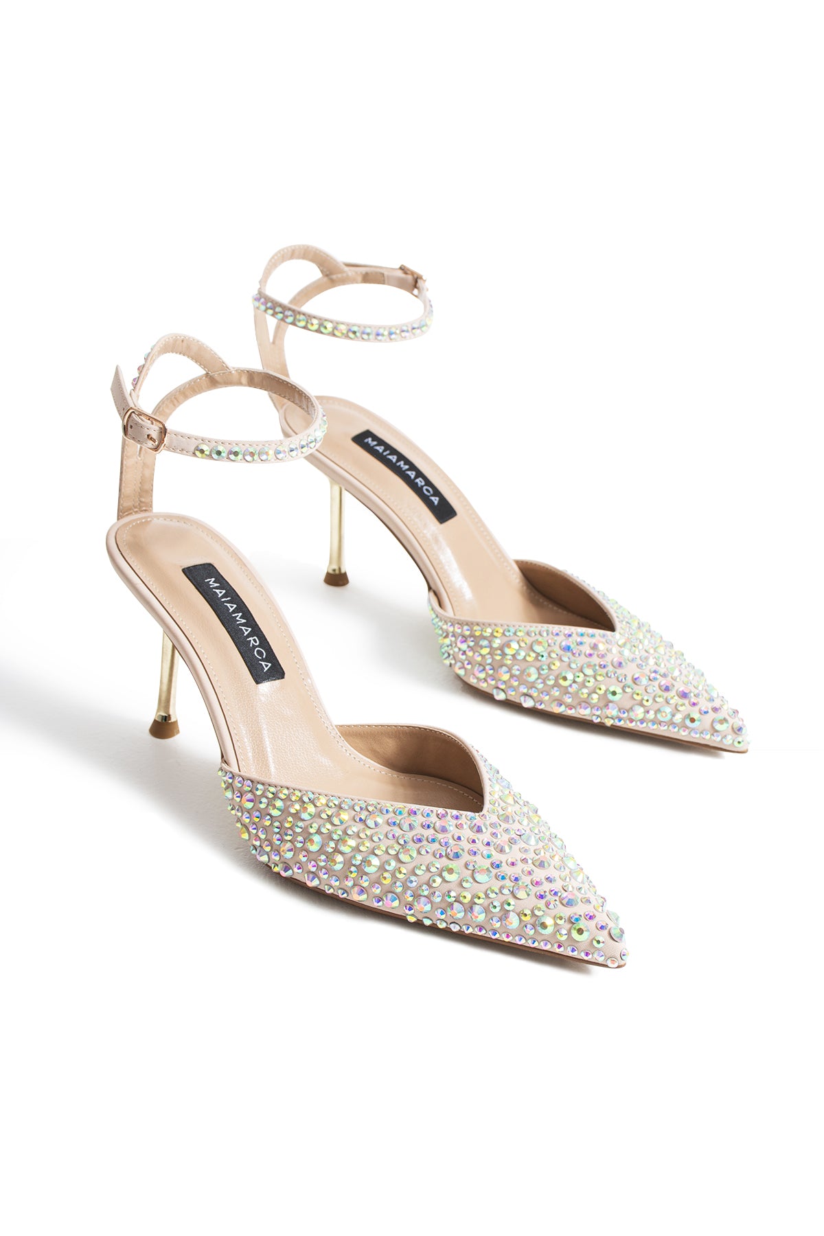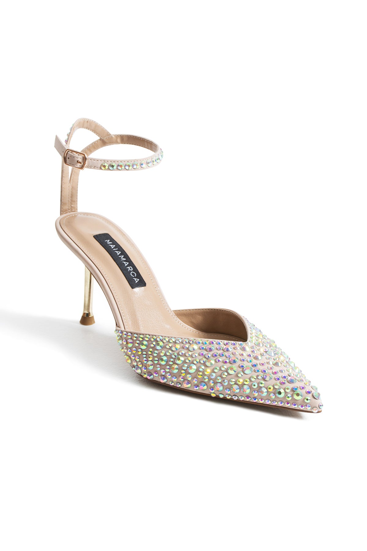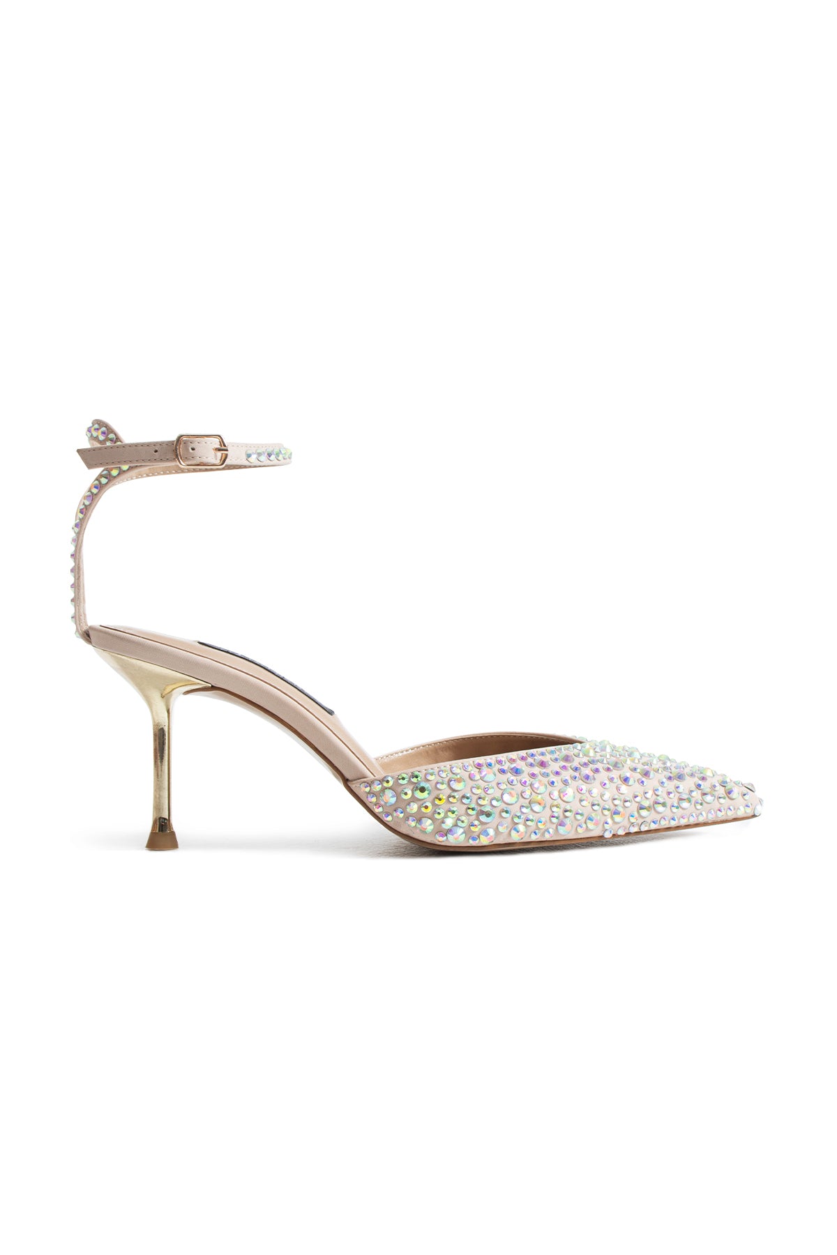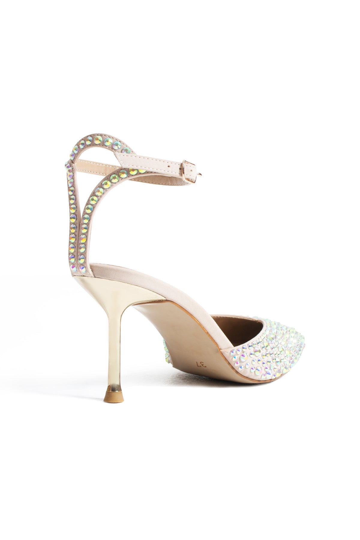 Sivri burun formu ayağa ince ve feminen bir hat kazandırırken, üst yüzeyi tamamen kristal taş detaylarla kaplanarak tasarıma derinlikli ve çarpıcı bir ışıltı katıyor. Zarif ayak bileği bantı ise hem estetik bir denge sağlar hem de ayağı güvenli bir şekilde kavrar.